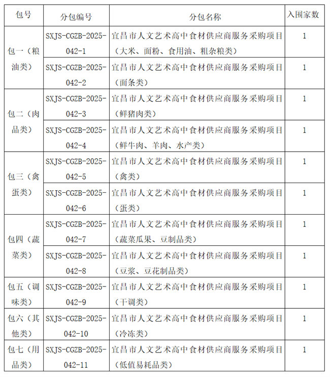 【项目概况】 宜昌市人文艺术高中食材配送供应商服务采购项目的潜在供应商应在宜昌市发展大道57-6号三峡云计算大厦A座20楼获取招标文件,并于2025年7月23日09点00分(北京时间)前递交投标文件。 一、项目基本情况 1.项目编号:SXJS-CGZB-2025-042 2.项目名称:宜昌市人文艺术高中食材配送供应商服务采购项目 3.采购方式:公开招标 4.采购需求:宜昌市人文艺术高中食材配送供应商服务采购项目共11个分包,具体分包如下,每个分包公开遴选一家供应商(备选两名排名第二、第三的供应商)为宜昌市人文艺术高中提供为期三年的物资供应。(详见招标文件第三章采购需求)